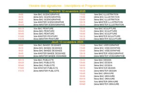 Planning horaire pour les signatures des inscriptions et des programmes annuels